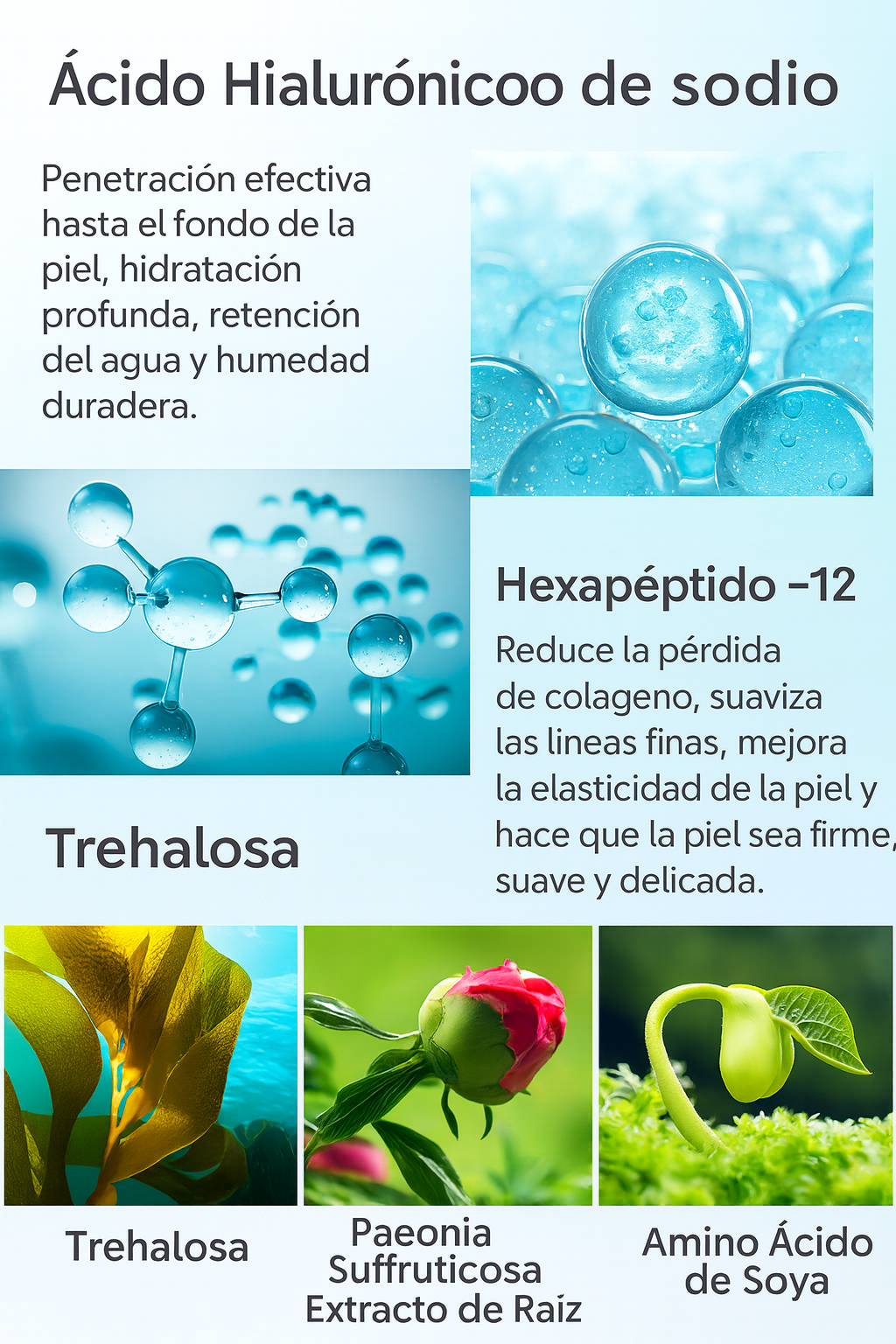 Todos estos problemas (sequedad, líneas finas, piel apagada) tienen una solución real… pero solo si tu piel recibe ácido hialurónico de calidad.